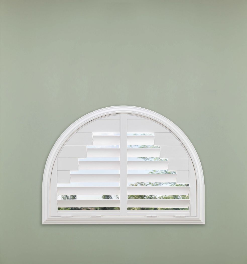 Palm Beach shutters offer fixed forms that can be customized to fit some of the most unusual and challenging shaped windows. These durable, moisture resistant polysatin shutters will add architectural interest and can be mixed with other window coverings in your room.