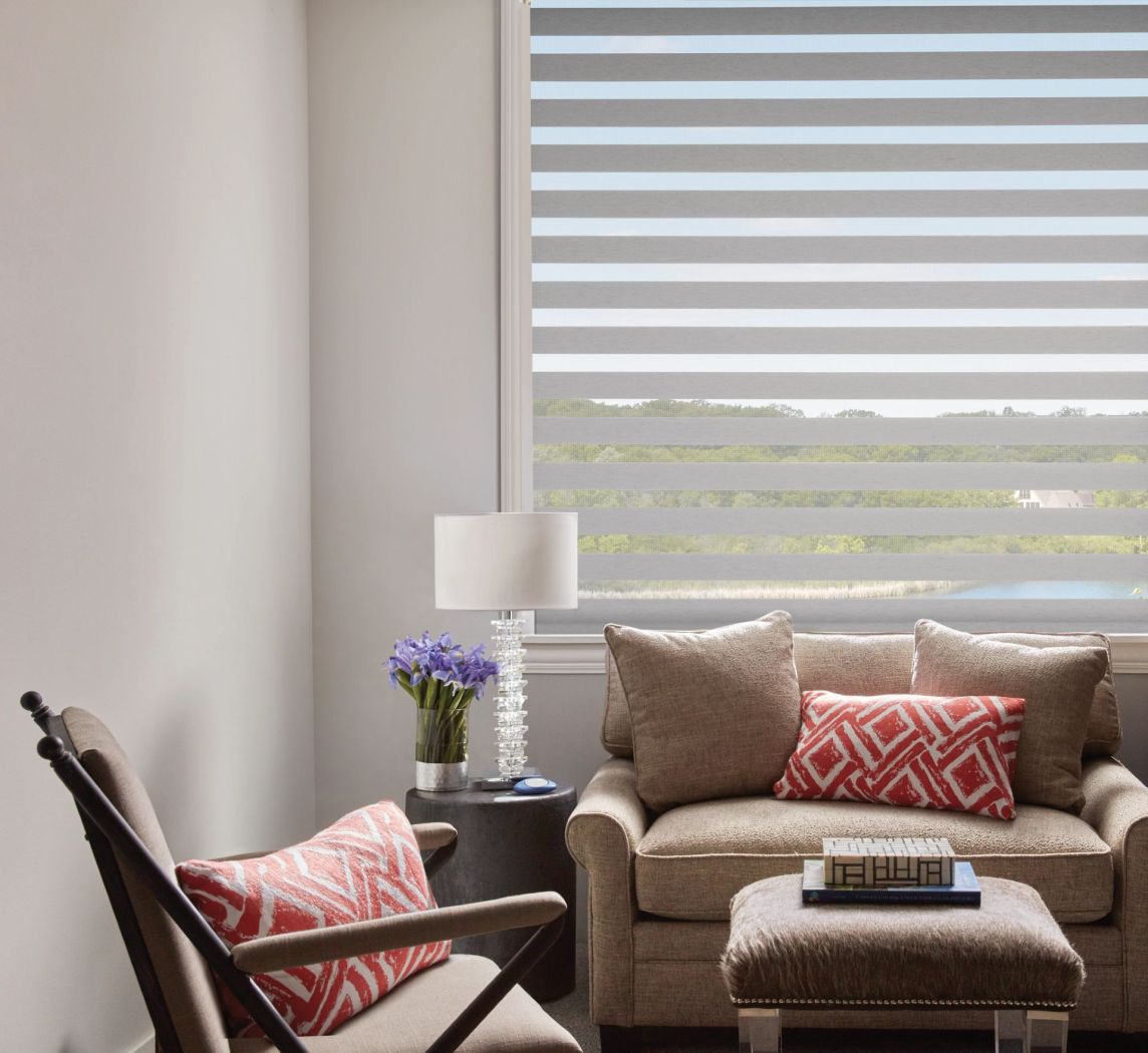 Modern, layered, sheer and solid fabrics. For a view when you want it and privacy when you need it. Banded shades create varying dimensions of light with the layered sheer and solid fabric bands.
