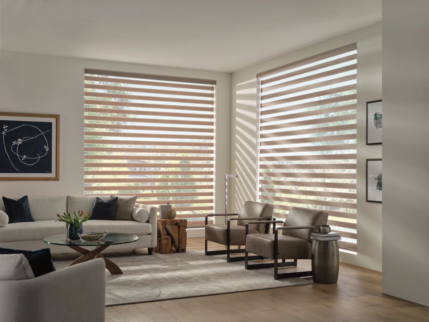 Modern, layered, sheer and solid fabrics. For a view when you want it and privacy when you need it. Banded shades create varying dimensions of light with the layered sheer and solid fabric bands.