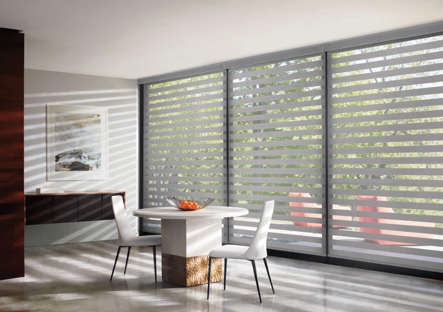 Modern, layered, sheer and solid fabrics. For a view when you want it and privacy when you need it. Banded shades create varying dimensions of light with the layered sheer and solid fabric bands.