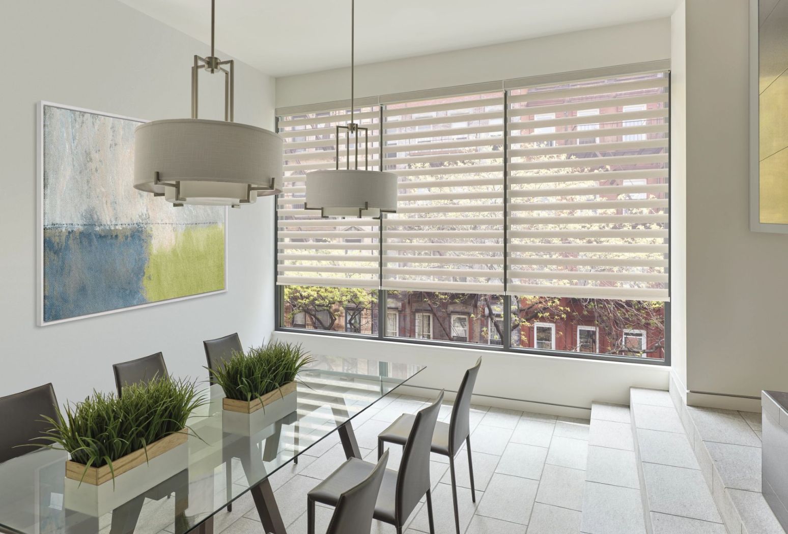 Modern, layered, sheer and solid fabrics. For a view when you want it and privacy when you need it. Banded shades create varying dimensions of light with the layered sheer and solid fabric bands.