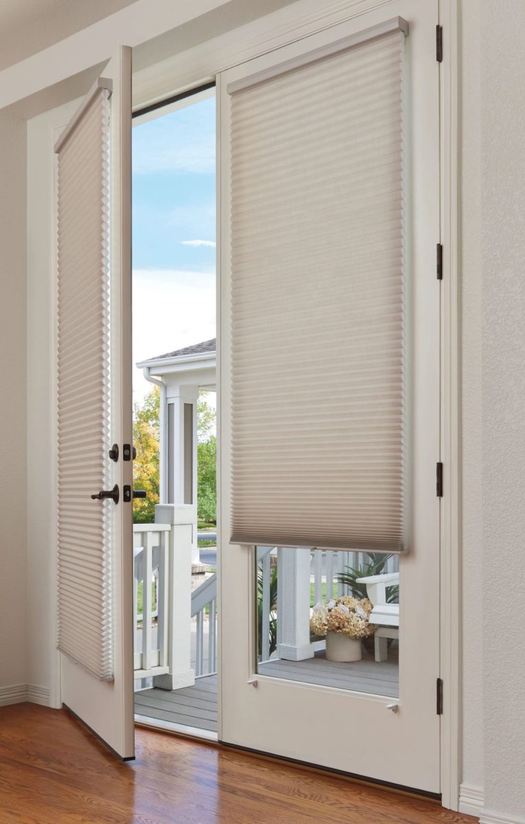 Covering garden doors with blinds can be challenging due to their size, the need for functionality, and potential for damage.  When selecting a blind or shade, slim headrails and hold-down brackets are often chosen for garden door shades because they offer a sleek, streamlined look and prevent the shades from moving or making noise when the door is opened or closed.